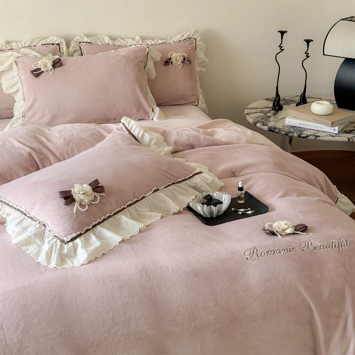 - + 2025新款亲肤舒适240克奶肤绒刺绣四件套-洛可可花园
